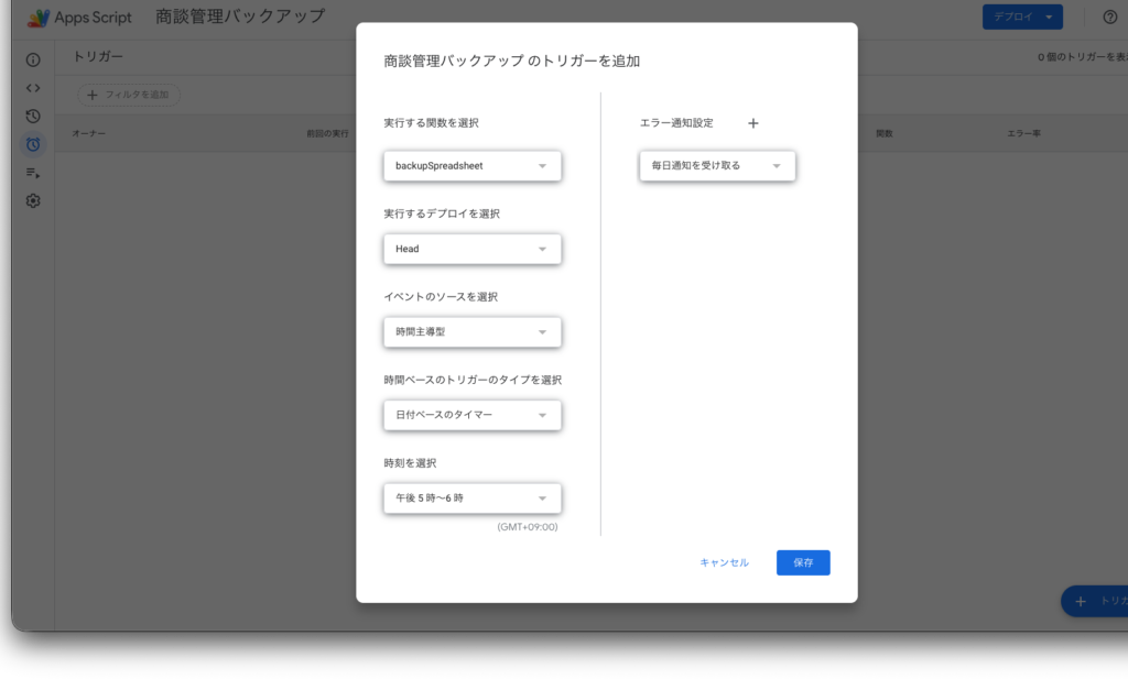 ◦ 実行する関数を選択: backupSpreadsheet