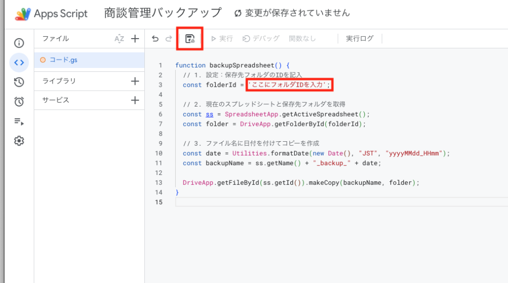 2. 貼り付け、フォルダIDを入力したら、画面左上の**「保存」アイコン(フロッピーディスクのマーク)**をクリックして保存します。