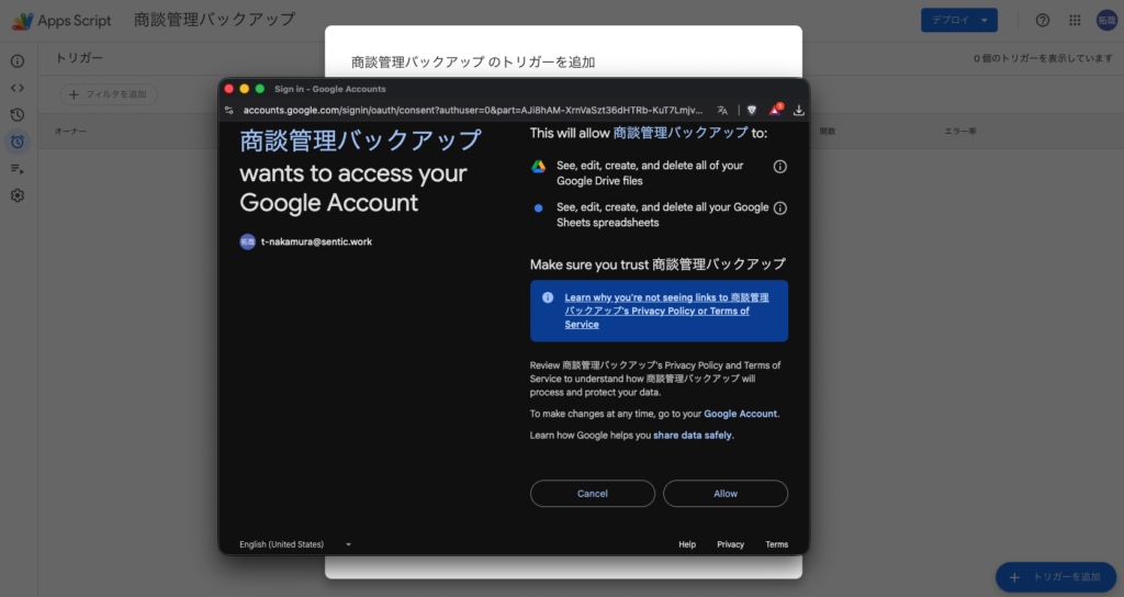 5. ※初回保存時のみ「認証の許可」という確認画面が出ますので、画面の指示に従ってアクセスを許可してください。